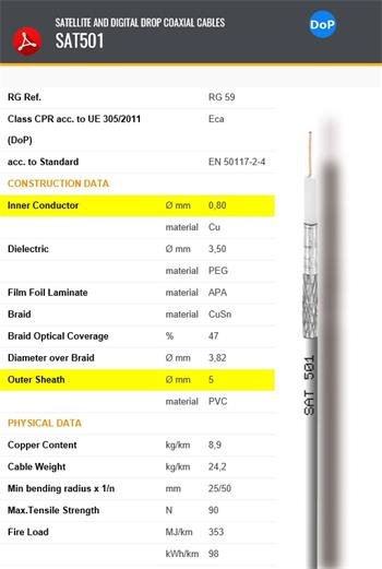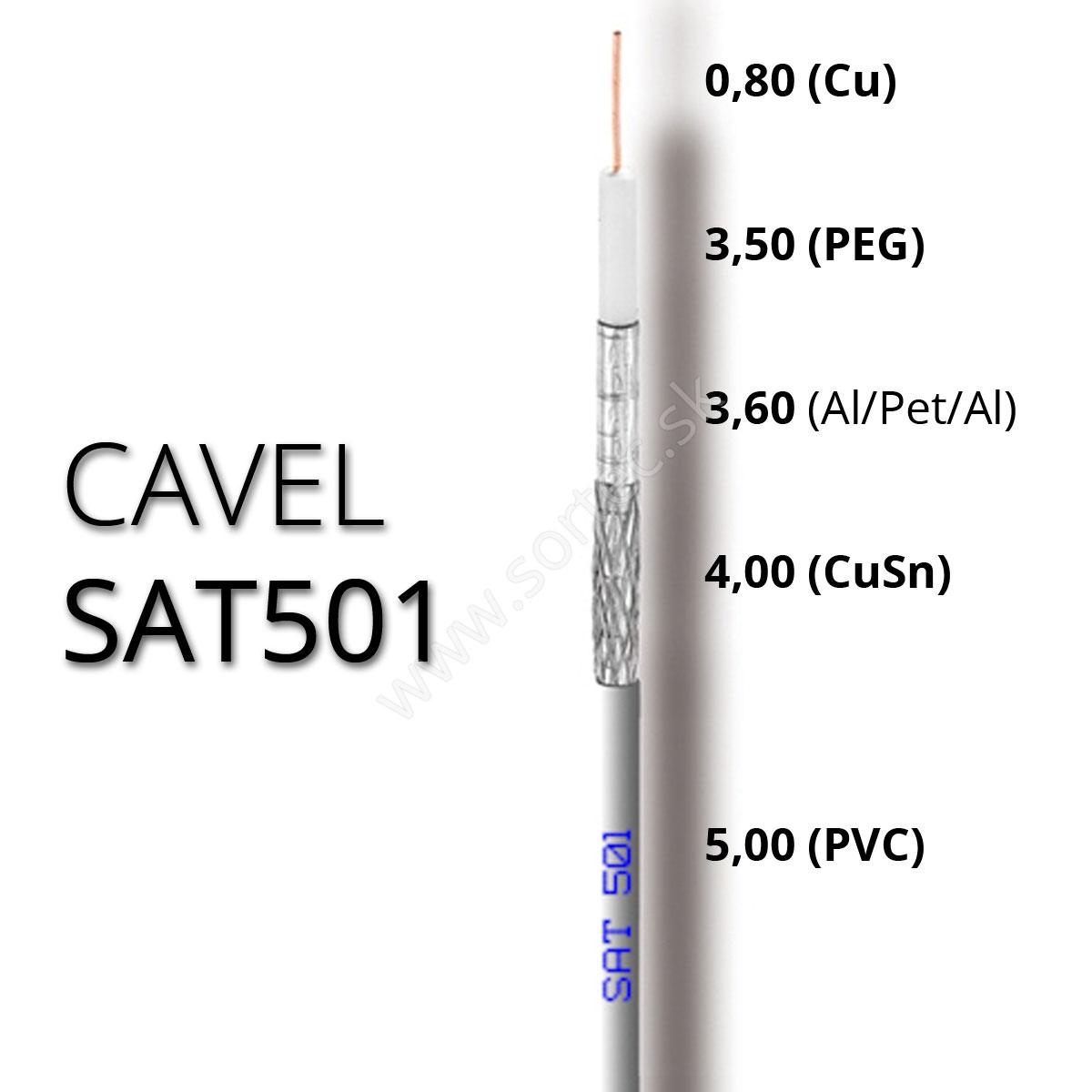 CAVELkód SAT501N KONŠTRUKČNÉ VLASTNOSTI Vnútorný vodič priem. mm 0,80 materiál Cu Dielektrikum materiál PEG priem. mm 3,5 Tienenie 1. Povrch laminátovej fólie materiál APA 2. Opletenie