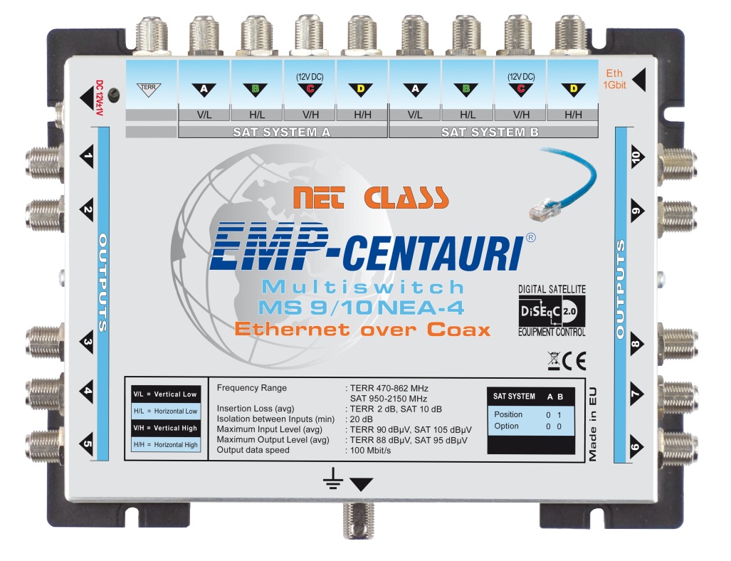EoC terminál NT13 sa používá v spojení s multiprepínačmi EMP-Centauri EoC. Nie sú potrebné žiadne nastavenia a je napájaný koaxiálným káblom z multiprepínača.