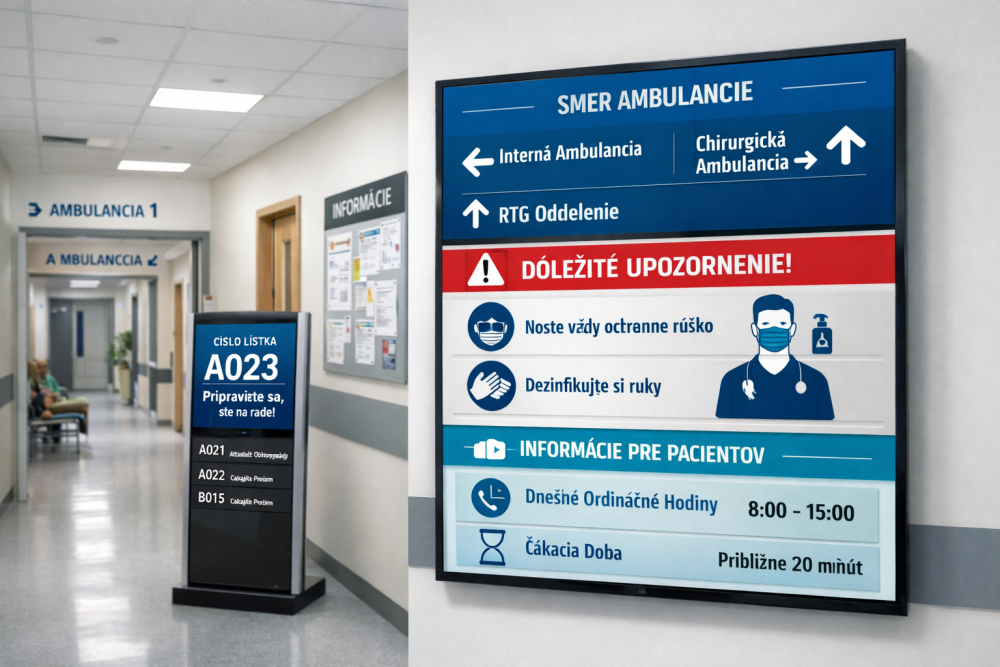 V zdravotníckych zariadeniach je dôležitá prehľadnosť, pokoj a rýchly prístup k informáciám. Digitálne obrazovky pomáhajú pacientom zorientovať sa, znižujú stres a zároveň odľahčujú zdravotnícky personál.