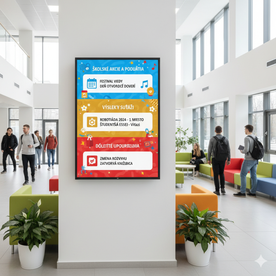 Rozvrhy, zmeny, oznamy a podujatia sa v školách menia často. Obrazovky umiestnené v priestoroch školy umožňujú komunikovať tieto informácie okamžite a bez zbytočného vysvetľovania.